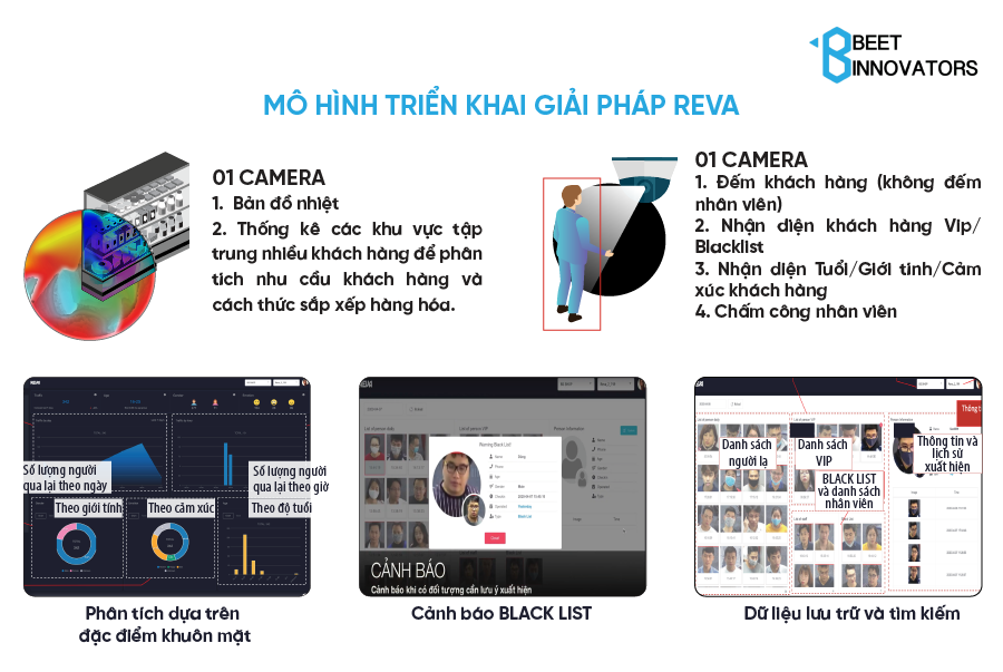 Để triển khai hiệu quả giải pháp REVA, người dùng cần lắp đặt ít nhất 2 camera AI trong không gian cửa hàng. Một camera AI có chức năng kiểm soát số lượng khách hàng thực có trong cửa hàng và nhận diện các khách hàng VIP hay những khách hàng thuộc nhóm đối tượng đã từng gây ra hành vi xấu, gây sự cố, thiệt hại cho cửa hàng trong quá khứ để cảnh giác, có biện pháp xử lý kịp thời. Đặc biệt, camera AI này còn có chức năng nhận diện khách hàng theo độ tuổi, giới tính và cảm xúc. Từ đó, đưa ra các chiến lược kinh doanh, marketing hiệu quả, sát với tình hình thực tế.